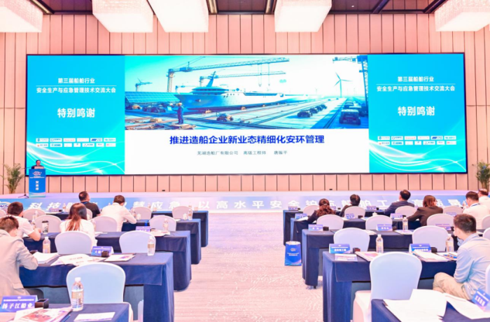 蕪湖造船廠有限公司安全環(huán)保中心高級工程師唐振平,代表公司在大會上做《推進(jìn)造船企業(yè)新業(yè)態(tài)精細(xì)化安環(huán)管理》主旨演講,分享近年來的安環(huán)管理與ESG推進(jìn)的成功實踐,系統(tǒng)性呈現(xiàn)蕪船在新業(yè)態(tài)下的安全環(huán)保(HSE)管理體系創(chuàng)新成果: